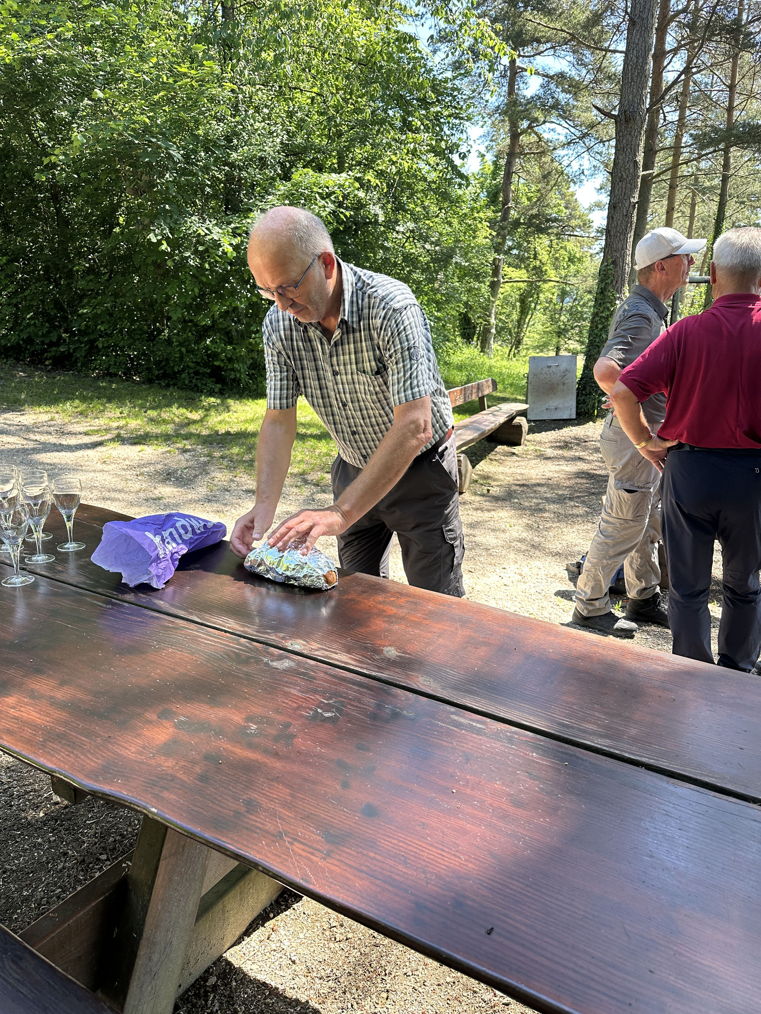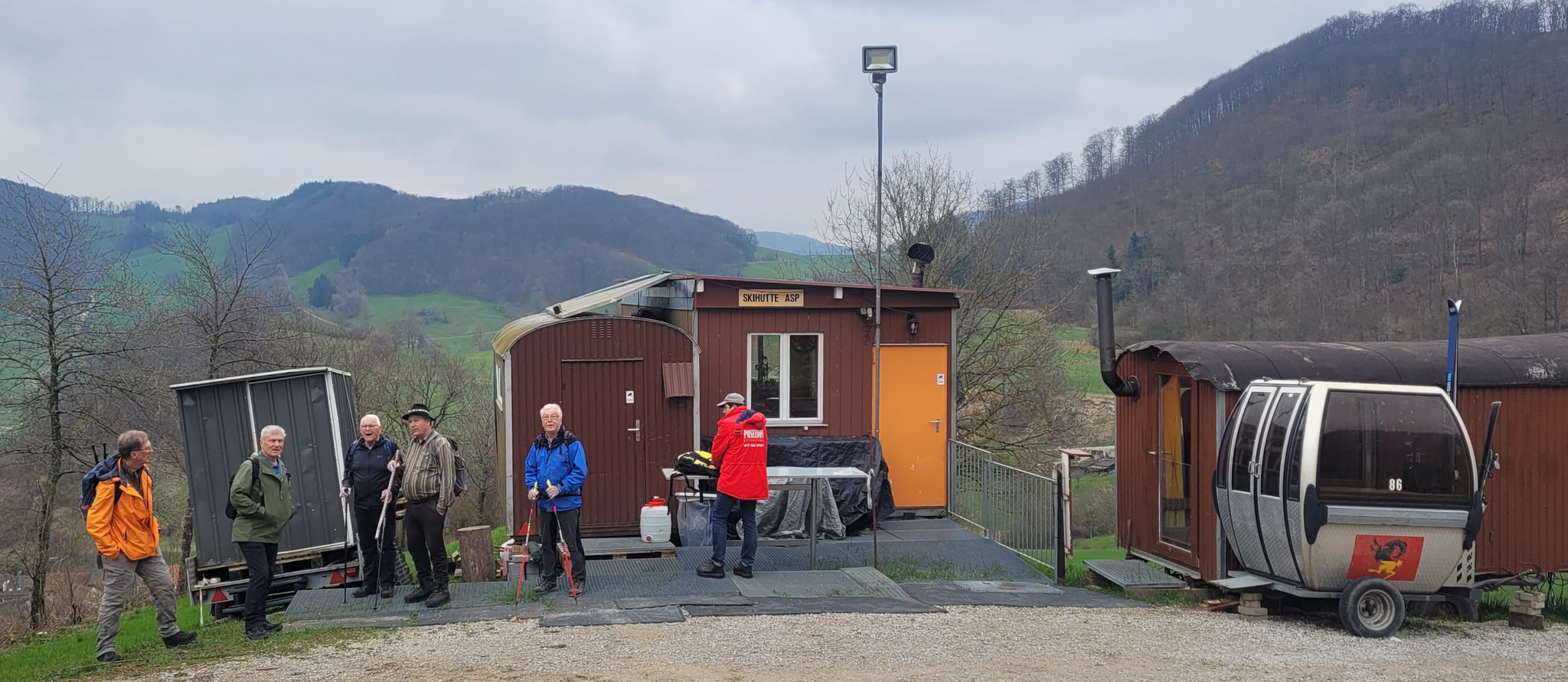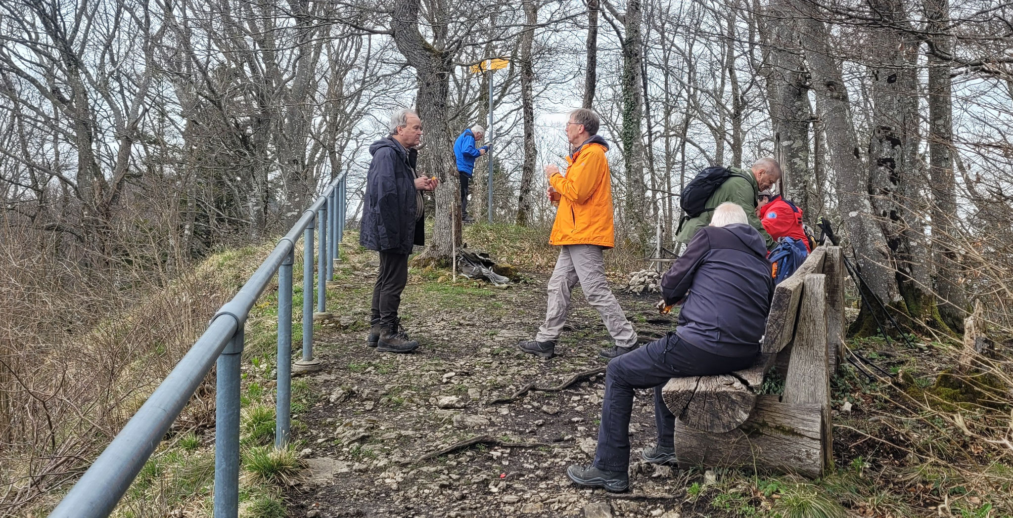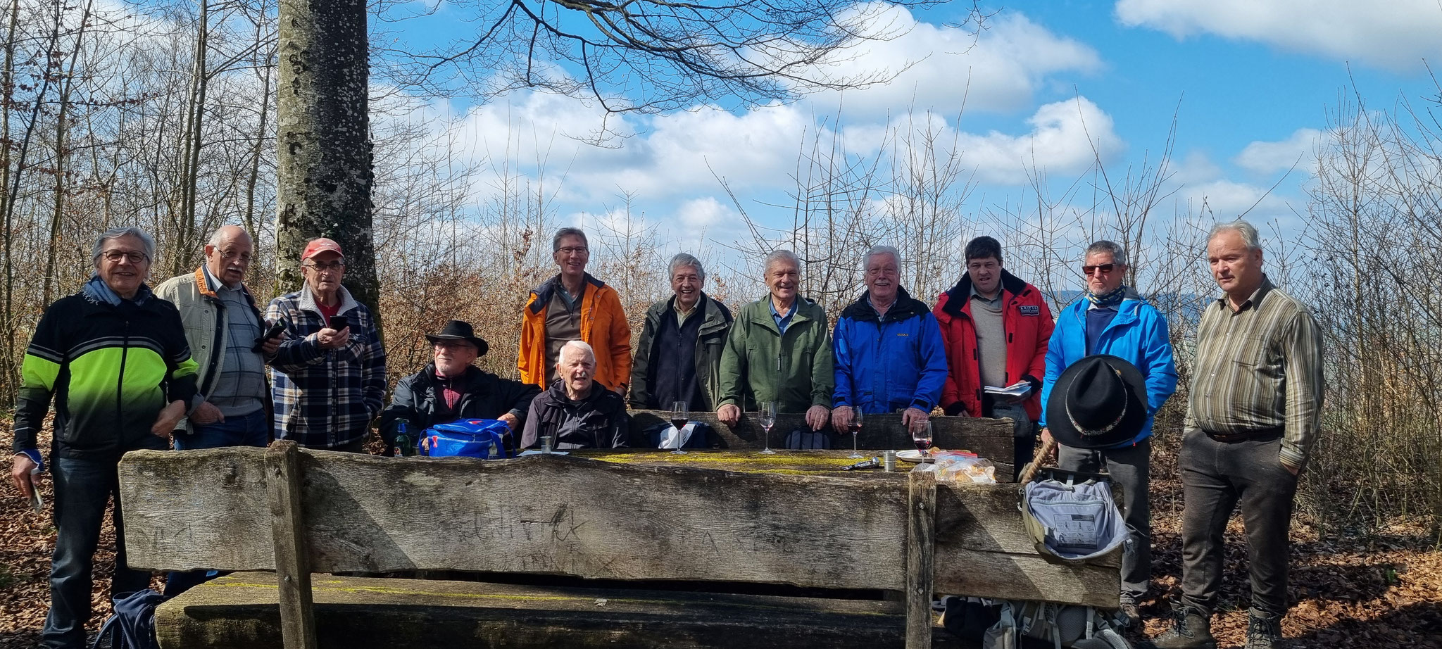 Mit dem Postauto fuhr die Wandergruppe um 09.21 Uhr von Frick nach Asp, wo wir fast die ganze Dorfstrasse von Asp (zur politischen Gemeinde Densbüren gehörend) durchliefen. Der Anstieg bis zur Stockmatt führte auch an der Skiliftanlage von Asp mit den beiden Skihütten vorbei. Bei der Stockmatt nahm die gut gelaunte Wandertruppe den Anstieg Richtung Strihe, dem mit 866,7 m höchsten Berg, der ganzheitlich im Kanton Aargau liegt, unter die Füsse. Oben angelangt, durfte bei gutem Weitblick ein «Gipfeltrunk» nicht fehlen. Über den Strihengrad ging es wortwörtlich über Stock und Stein an einen weiteren Aussichtspunkt im Jurapark vorbei zur Waldhütte Wölflinswil. Dort loderte schon das von Hans Jörg und seinen Helfern vorbereitete Feuer, um unsere mitgebrachten Grilladen zum Brutzeln zu bringen. Die 12 Teilnehmenden genossen sichtlich die frühlingshafte Atmosphäre im Wald und gewisse vergassen auch nicht, erste Marketingsmassnahmen zu platzieren für unsere Konzerte vom 14./15.11.2025!