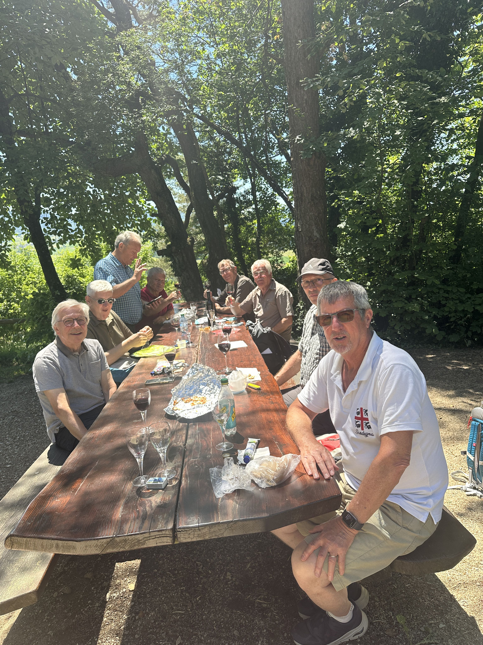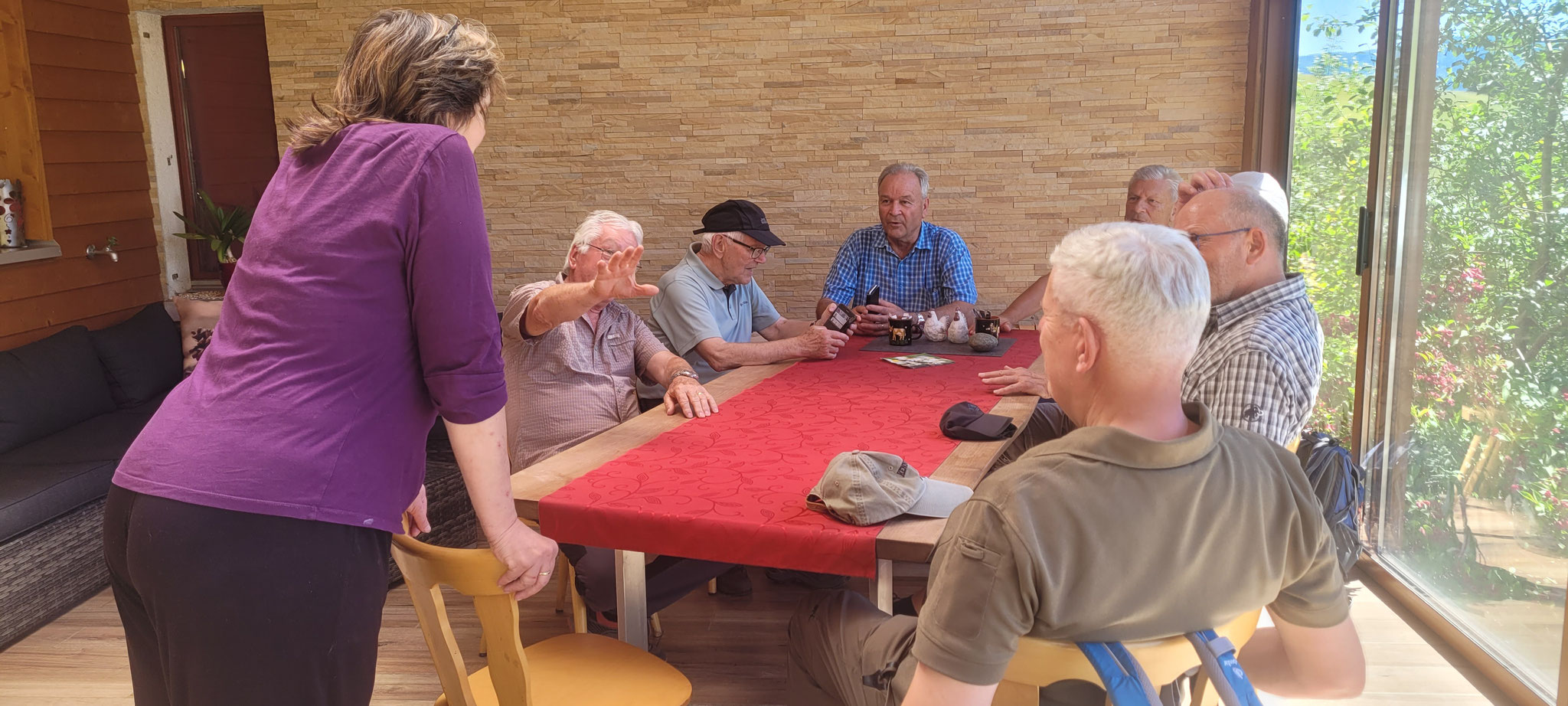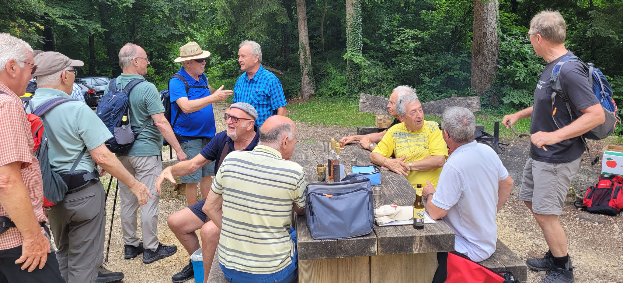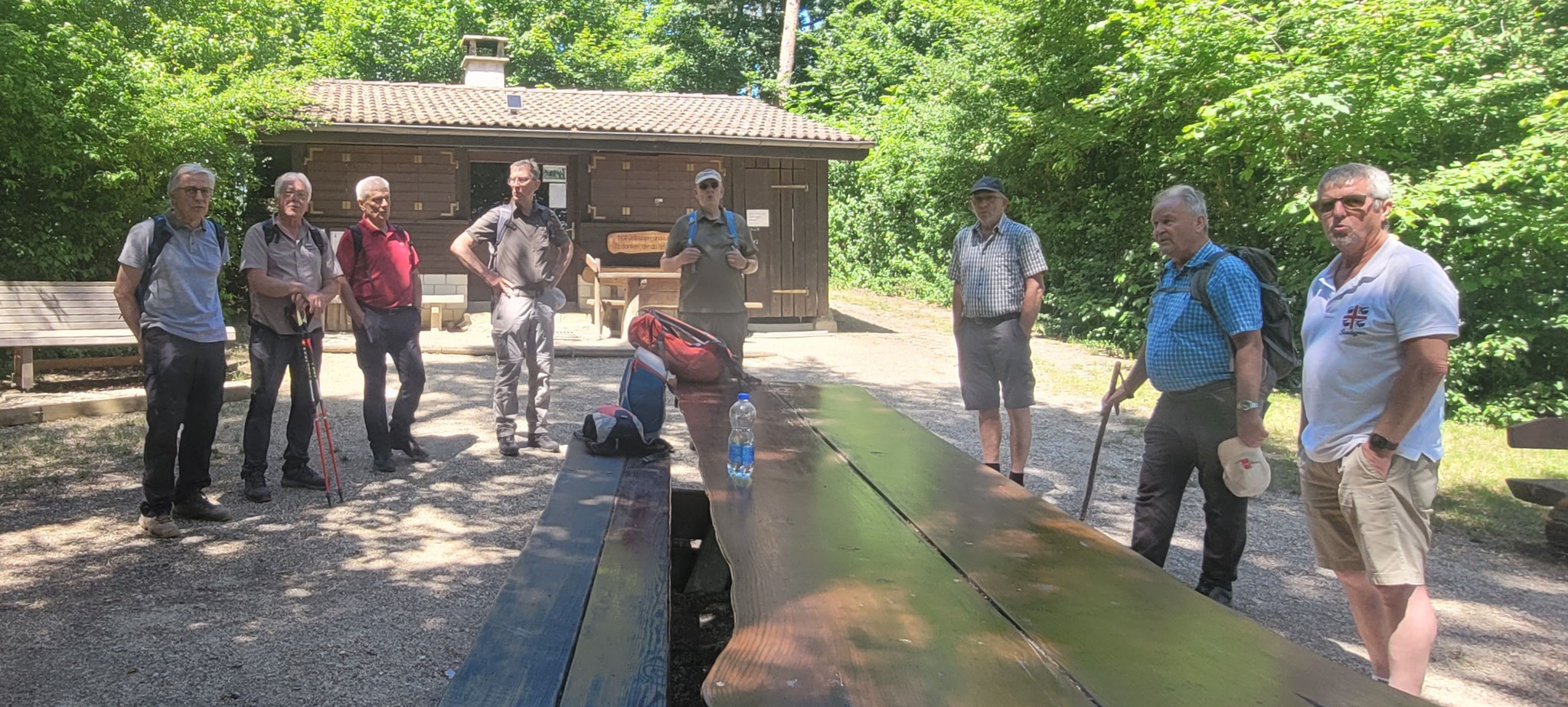Beginn der Wanderung war beim Buswendeplatz in Elfingen, wo neun wanderfreudige Männerchörler bei herrlich schönem Wetter nach 9.00 Uhr starteten. Nach etwa dreissig Minuten erreichten wir eine Baumkappelle mit wunderschöner Aussicht. Dort verwöhnte uns Bernadette mit Kaffee und Gipfeli. Danach marschierten wir weiter Richtung Waldhütte Bözen, wo wir kurz nach 11.00 Uhr eintrafen. Der Wanderleiter offerierte uns Rosé mit Zopf zum Apéro. Die Aus- und Weitsicht bei diesem Platz, einfach grandios! Als Feuerverantwortlicher wurde Toni verknurrt. Er reiste mit dem Velo an und konnte so auch noch seinen geschätzten Beitrag leisten. Wir grillierten unser Mitgebrachtes bei perfekter Glut. Bei Speis und Trank und guten Gesprächen konnten wir so die Mittagsrast in vollen Zügen geniessen. Die Zeit verflog im Nu und so ging es dann nach der relativ langen Pause talwärts Richtung Bözen. Einen nicht geplanten, spontanen Halt gab es beim Moosmatthof bei Erika Barth. Dort wurden wir mit Wein und Cornets verwöhnt, dabei kam auch der Gesang nicht zu kurz. Weiter gings zu unserem letzten Ziel dem Restaurant Post in Bözen. Bei Kaffee und Nussgipfel liessen wir den Wandertag ausklingen.