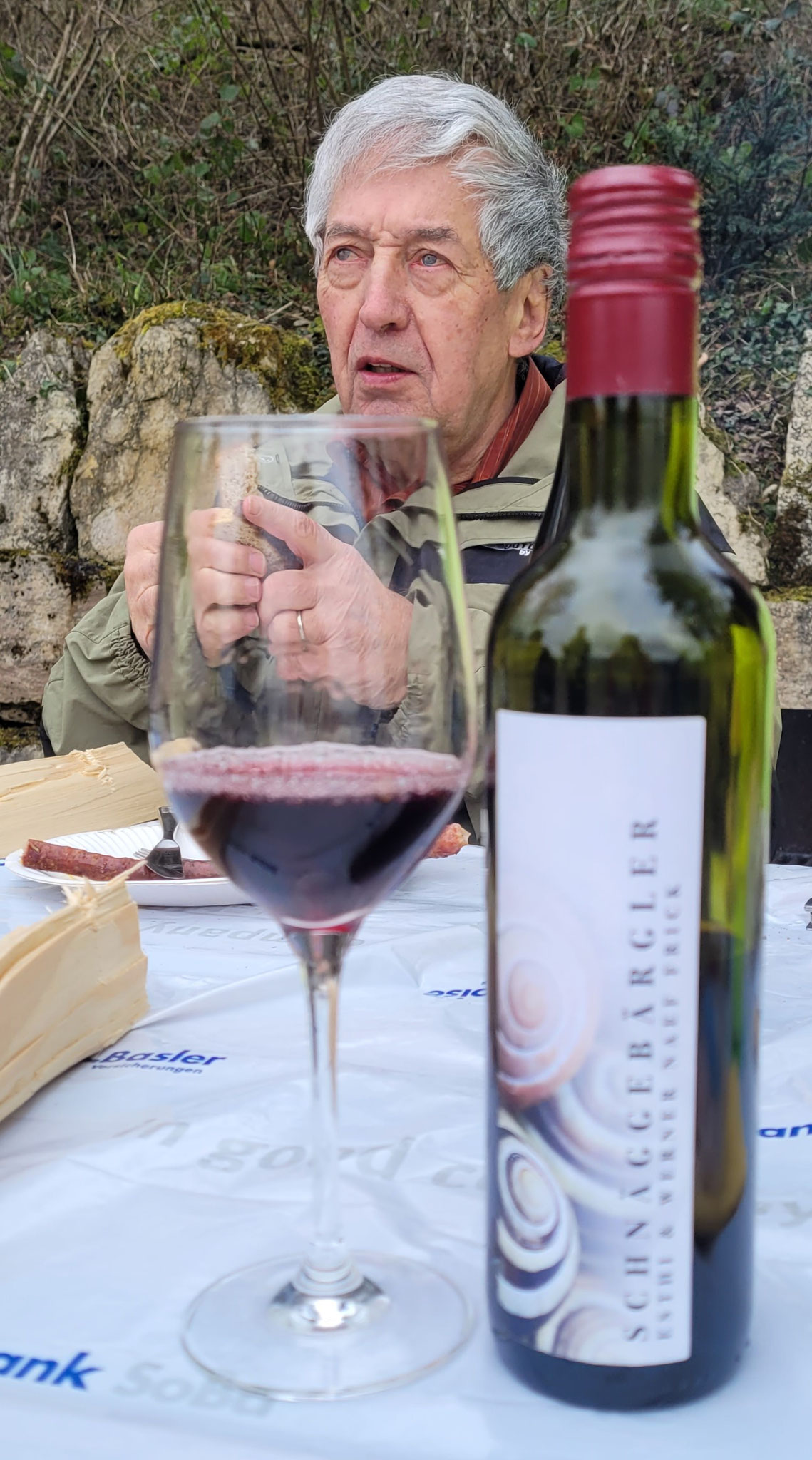 uns Rita Mathis einen kleinen Apéro mit einem Sandwich. Gestärkt führte uns der Weg durch einen Wald mit wunderbaren Schneeglöckchen Feldern. Wir näherten uns dem Kapf, einem Ortsteil oberhalb von Mumpf, und marschierten weiter zu unserem Ziel «Schönegg». Hans Jörg Huber und Peter Boss fuhren mit dem Auto zur Grillstelle und entfachten bereits das Feuer für unser Mittagessen. Wie immer wurde aber zuerst unter der Leitung von Kurt Schmid gesungen und einen Apéro genossen. Dazu bestaunten wir die wunderbare Aussicht über den Rhein und das Wehratal.