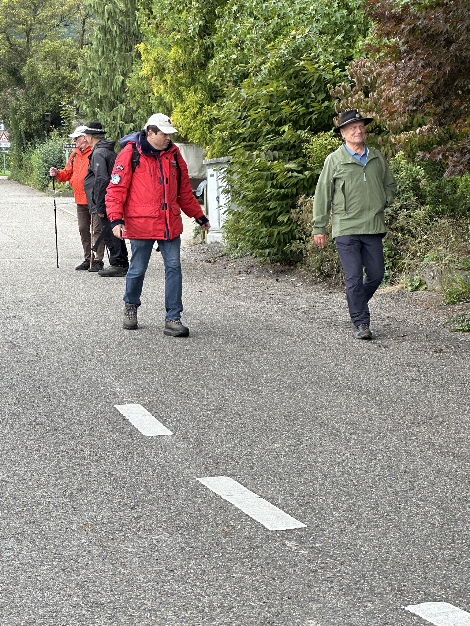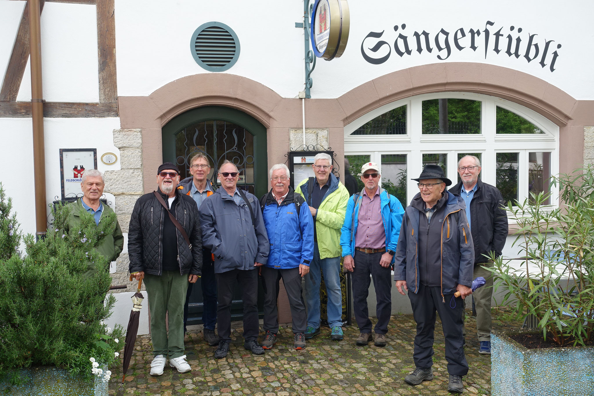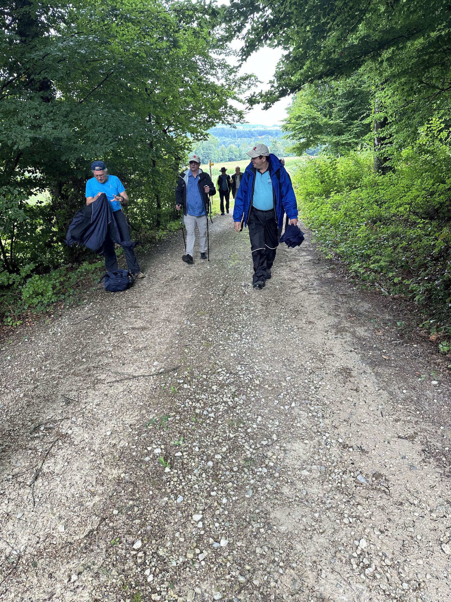 Nach einer langen Regenperiode meinten es unsere vier Peter gut mit ihren Kollegen und kontaktierten ihren Chef im Himmel. Siehe da, es fruchtete. Bei herrlichem Wanderwetter versammelten sich 7 Männerchörler beim Bahnhof SBB in Stein zum Fussmarsch nach Mumpf. Vorbei an der «Grasskipiste» oberhalb des Dorfes, welche immer noch bei Clubanlässen benützt wird.