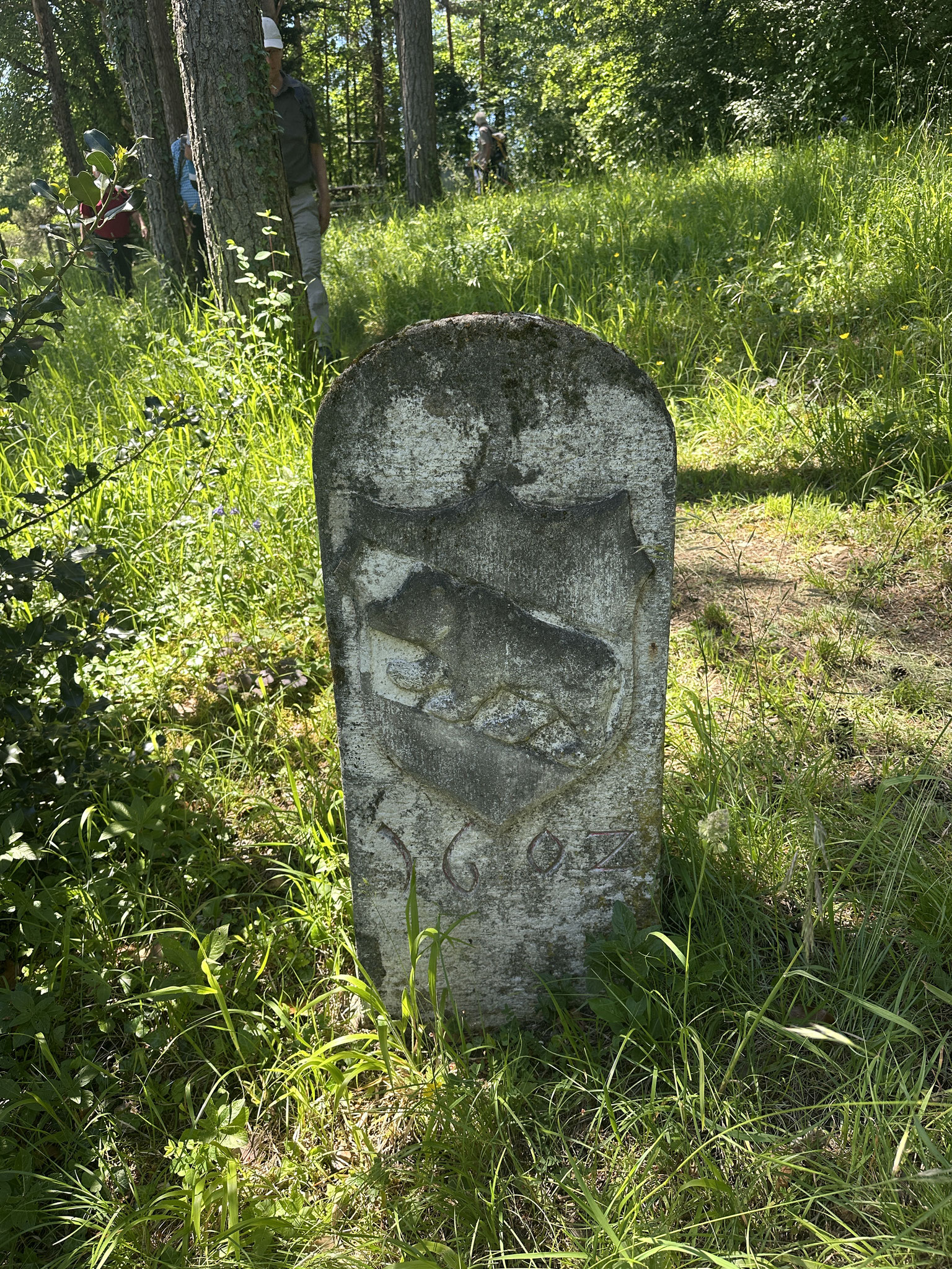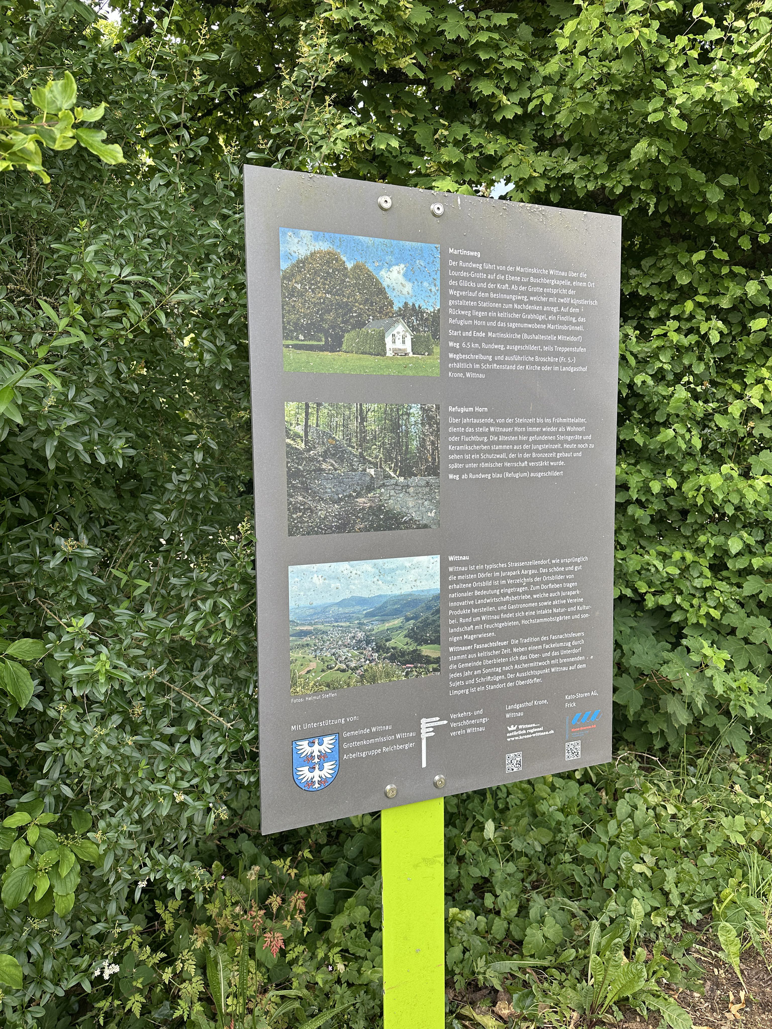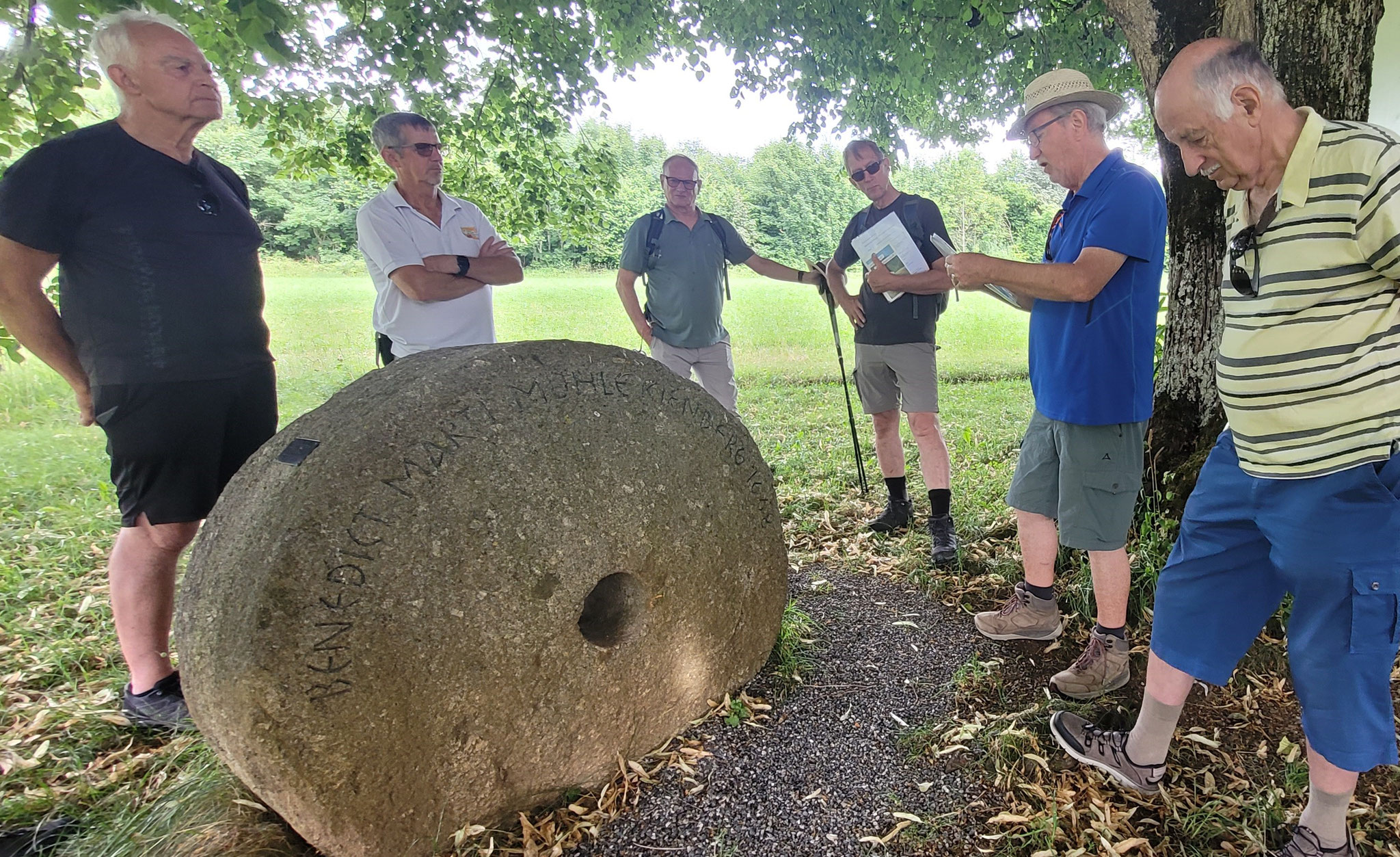 Um 9 Uhr begrüssten wir einander beim Brunnen auf dem Mühlerain mit einem ersten kühlen Schluck aus unseren Zinnbechern. In einem Büssli fuhr die Wandergruppe auf den Wittnauer Buschberg. Vom Parkplatz aus wanderten wir dem sagenumwobenen «Niemandsland» entlang zur 1868 erbauten Buschbergkapelle. Zwischen Wittnau, Anwil und Kienberg exitierte jahrhundertelang ein rechtsfreies Gebiet von 63 Aren, der sog. »Heimatlosenplatz». Erst 1931 einigten sich die Kantone AG, BL und SO, neue Grenzen zu ziehen. Beim Mühlestein neben der kleinen Holzkapelle angekommen, deren Ursprung bis ins Jahr 1668 zurück reicht, hörten wir die bekannte Legende aus dem Mirakelbuch des Klosters Mariastein. Der Müller von Kienberg wurde damals wunderlich - durch ein Mirakel - vor dem vom Wagen stürzenden Mahlstein gerettet. Aus Dankbarkeit liess er an dieser Stelle ein Kreuz errichten und im Kloster Mariastein eine Votivtafel malen. Das Baselbieter Lied und unser Fricktalerlied hier zu singen, drängte sich natürlich auf; eigentlich fehlte nur das Solothurner Lied.