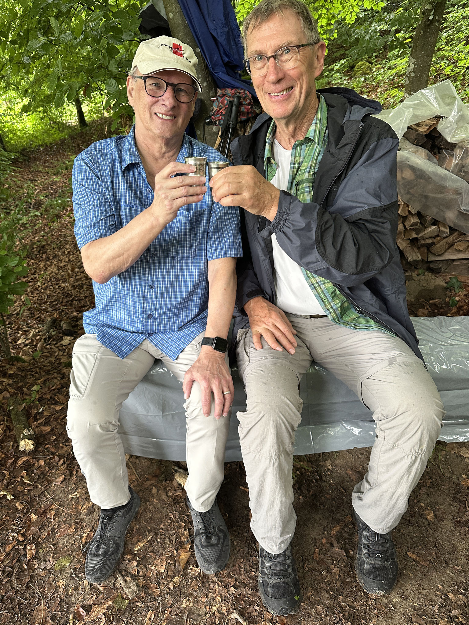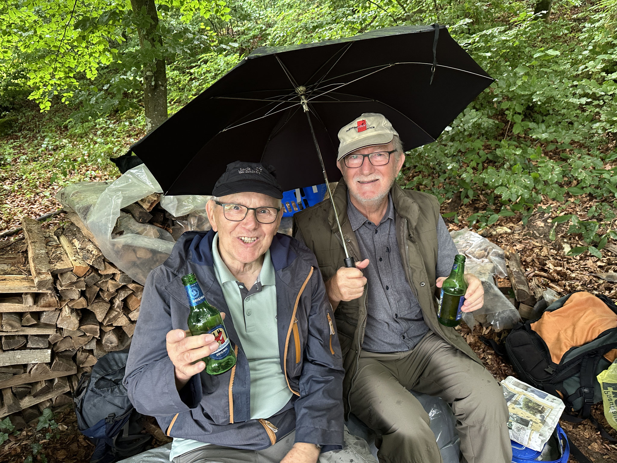 Trotz zunehmendem Regen wurde die Stimmung immer besser. Nach Verzehr und Tranksame hielten wir der etwas garstigen Witterung eifrig mit schwungvollem Gesang entgegen und erfreuten so, mangels Zuschauern, die Vögel und Waldtiere.