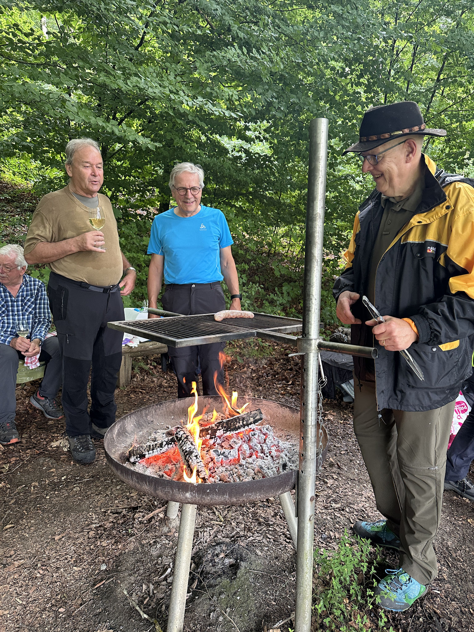 Nach einem kühlen Bierchen marschierten wir durch das Thiersteinberg «Naturwald-Reservat» übers «Fazedelle-Chrüz», wo Wegenstetten, Schupfart, Wittnau und Gipf-Oberfrick an einander grenzen, weiter über den Gratweg zur Ruine Alt-Thiertein. Eine Gourmet-Dreiergruppe empfing uns mit einem Apéro und einem bereits lodernden Feuer, an dem wir uns mit Köstlichkeiten vom Grill stärkten. Zusammen mit den drei Bikern, die den Thierstein- und Homberg auf eigene Faust erkundeten, und den acht Wandergesellen ertönten auch bald stramme Lieder aus 14 Kehlen durch den Wald.