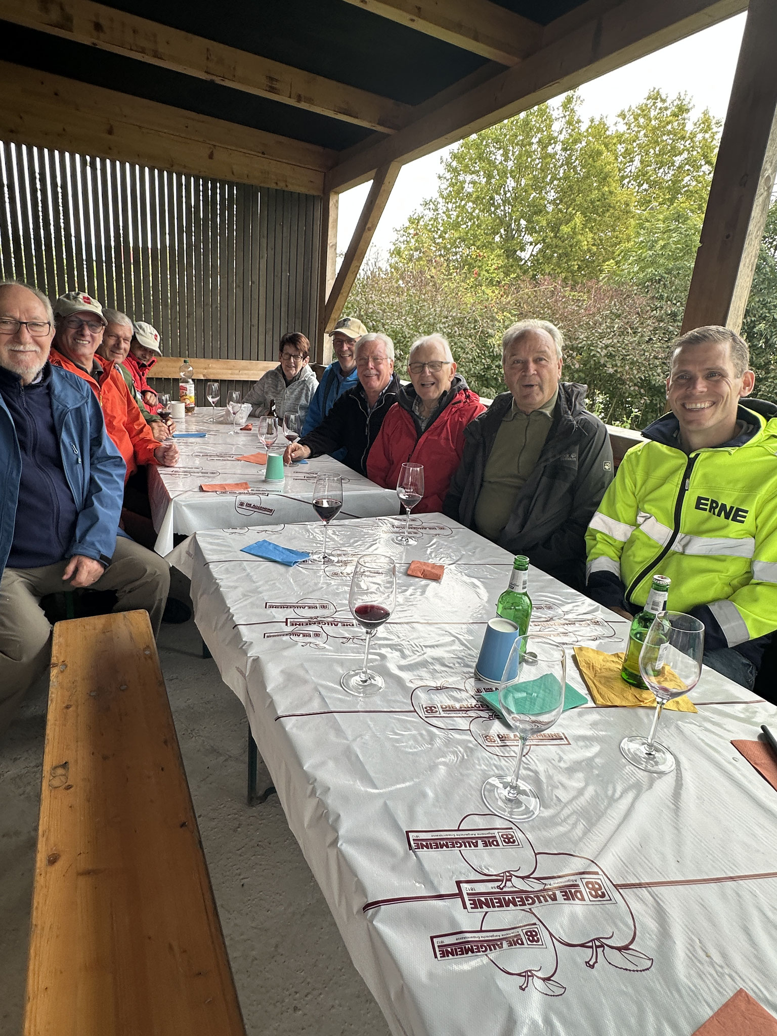 Nach dieser Stärkung, einer halbstündigen Pause inkl. Aussicht auf die verschleierte und neblige Umgebung ging es abwärts nach Münchwilen, quer durch das Dorf und Richtung Industrie. Hier empfing uns René Freiermuth und führte uns zur Gin-Lounge der Firma Holzbau Erne. Die Tische waren bereits aufgedeckt. Die Männerchor-Frauen Rita und Antonia haben alles bereitgestellt, ein Feuer angemacht und uns eine feine Bauernbratwurst serviert. Auch ein Bier, Mineralwasser und ein Zeininger Rotwein fehlten nicht.